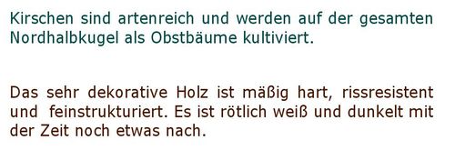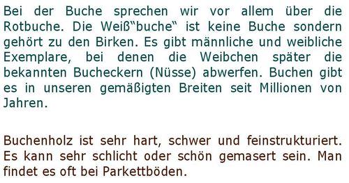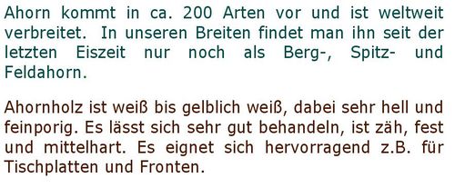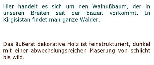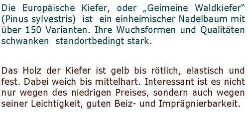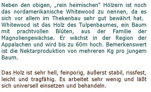 Zur Wahl des Holzes: Grundsätzlich lassen sich natürlich fast alle Holzsorten aus guten Quellen beschaffen. Ich empfehle jedoch die Verwendung nicht-tropischer Hölzer, da Tropenhölzer nur selten mit koscheren Zertifikaten zur Nachhaltigkeit (FSC) zu bekommen sind. Im folgenden habe ich die 15 meistverwendetesten Hölzer dokumentiert. Klicken Sie auf ein Bild, und Sie erhalten weitere Informationen.
